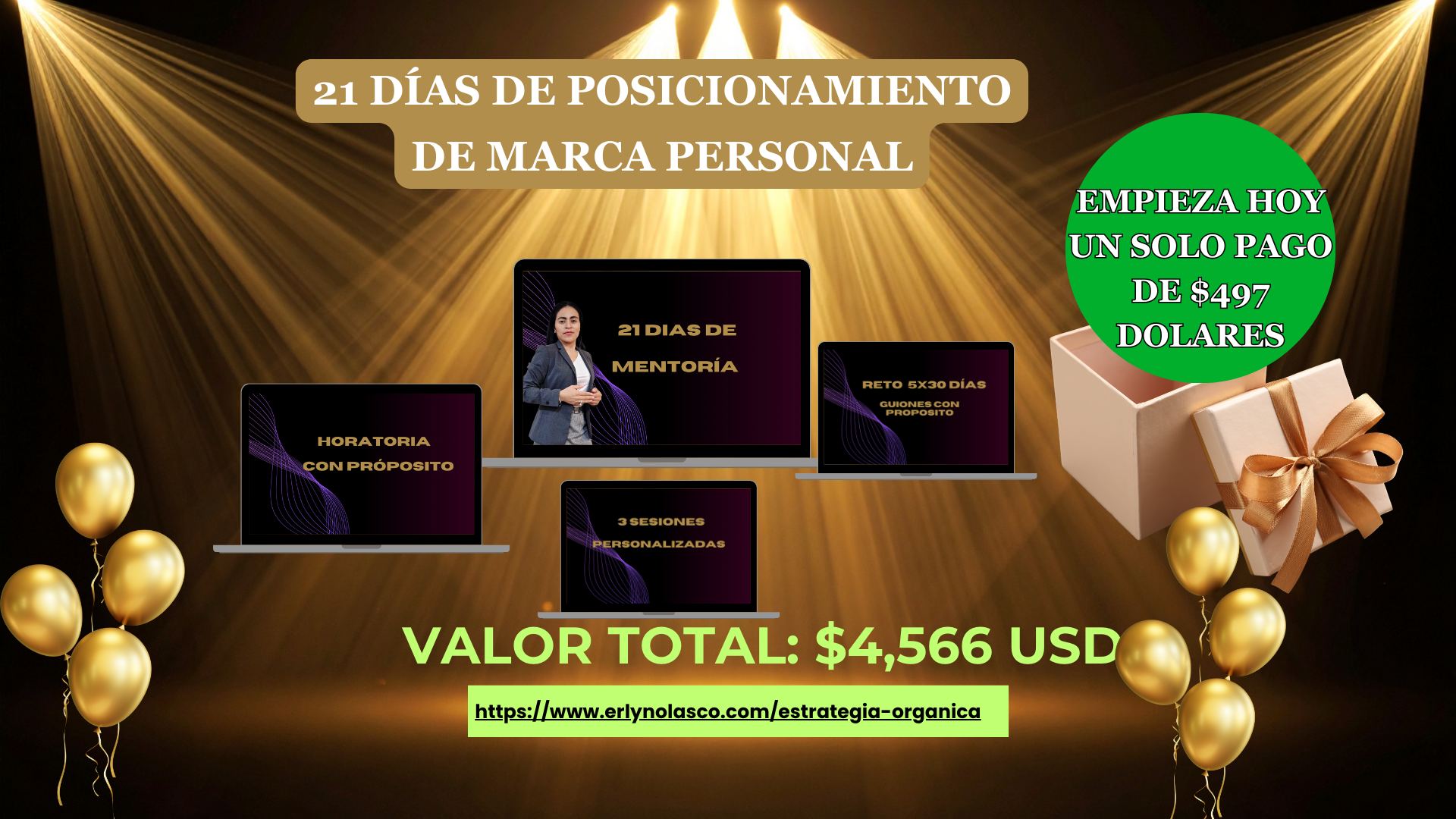 Este mentoría de 21 días consecutivos donde te enseñará a posicionar tu marca personal con una estrategia orgánica y comprobada y simple que puedes utilizar como yo y mis alumnas aplicamos en nuestra marca personal como emprendedora digital.